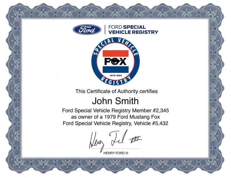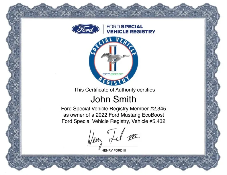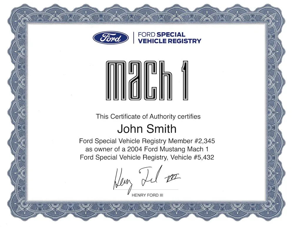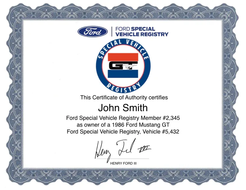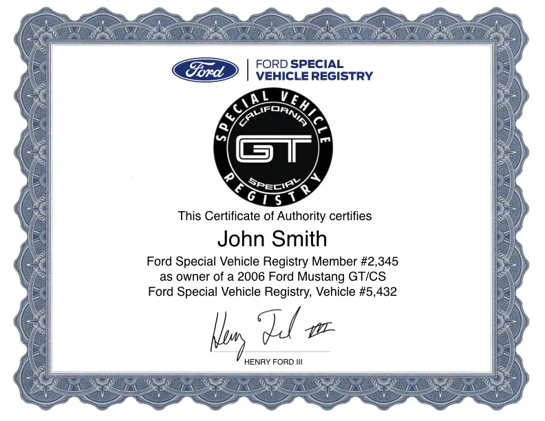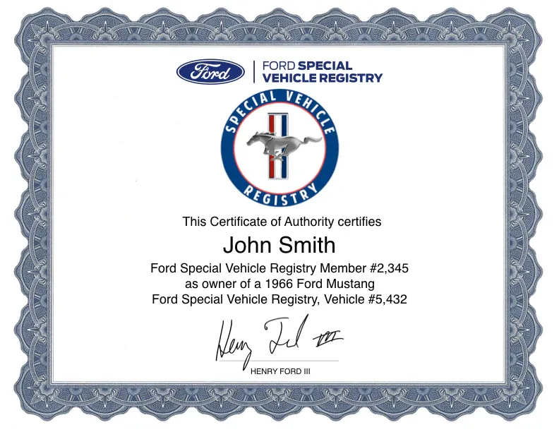 In order to order a certificate, you’ll need the following information: 1. Owner(s) name to be printed on certificate, 2. Year of Mustang, 3. the Mustang’s unique I.D. number, which can be found under your account on the Ford’s Special Vehicle site and 4. your account I.D., which is also found under your account at Ford’s Special Vehicle Registry.